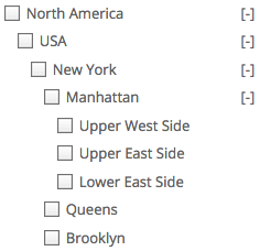For example, let’s assume a Checkboxes facet with a taxonomy “location” set as its data source. This taxonomy has five hierarchical levels, from continents to countries, cities, boroughs, and areas.