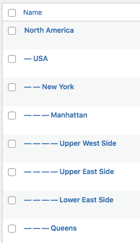 In a non-hierarchical/flat taxonomy, there are no levels: all terms are at the same level. In a hierarchical taxonomy, the terms are structured in a tree-like hierarchy: one or more (nested) levels of parent and child terms. The example on the right shows a “location” taxonomy with five nested levels of terms.