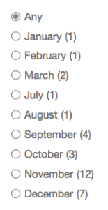To show only months, use m (the month number, e.g. 01) for the facet_value and F (the whole month name, e.g. January) for the facet_display_value. A Radio facet showing available months will then look like the image on the right.