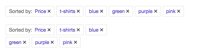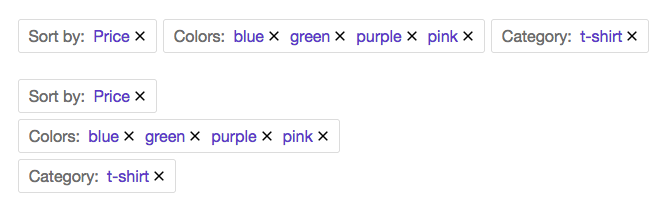 add_action( 'facetwp_scripts', function() { ?> <script> (function($) { $(function() { if ('object' != typeof FWP) return; // Re-add skipped facet types, or skip other facets by facet type. // Default = ['pager', 'reset', 'sort'] // Example: re-add Sort facets. FWP.hooks.addFilter('facetwp/selections/facet_types_skipped', function( skipped ) { skipped = ['pager', 'reset' ]; return skipped; }); // Customize the HTML of the facet selections container that wraps the facet label and all selections per facet. If needed per facet, based on the facet_name. // Default HTML: <li>{selection_content}</li> // Example: Remove <li></li> around selection label + selection choices, but only if the facet name is not 'my_sort_facet' FWP.hooks.addFilter('facetwp/selections/facet_selection_html', function( selection, facet_name ) { if ( facet_name !== 'my_sort_facet' ) { selection = '{selection_content}'; } return selection; }); // Customize the facet selection label HTML for all or specific facets. Or remove the label entirely. // Default HTML: <span class="facetwp-selection-label">{selection_label_content}</span> // Example: Customize label for the 'my_sort_facet' facet, and remove the label for all other facets. FWP.hooks.addFilter('facetwp/selections/facet_selection_label_html', function( selection_label, facet_name ) { if ( facet_name == 'my_sort_facet' ) { selection_label = '<span class="facetwp-selection-label">Sorted by: </span>'; // Add custom label for Sort facet } else { selection_label = ''; // Remove label for all other facets } return selection_label; }); // Customize the HTML of individual facet choices // Example: Add <li></li> around individual selection choices instead of around all selections per facet. // With an exception for the 'my_sort_facet' facet. // Note that you'd also need to remove the <li></li> around the facet selections container, using the facetwp/selections/facet_selection_html hook. FWP.hooks.addFilter('facetwp/selections/facet_selection_choice_html', function( selection_choice, facet_name ) { if ( facet_name !== 'my_sort_facet' ) { selection_choice = '<li>' + selection_choice + '</li>'; } return selection_choice; }); }); })(fUtil) </script> <?php }, 100 ); add_action( 'wp_head', function() { ?> <style> .facetwp-selections ul { margin: 20px 0; } .facetwp-selections li { display: inline-block; margin: 0 6px 6px 0; padding: 8px 10px; list-style-type: none; border: 1px solid #ddd; border-radius: 3px; } .facetwp-selections .facetwp-selection-value { color: #6233ca; } .facetwp-selections .facetwp-selection-value:hover { text-decoration: underline; } .facetwp-selections .facetwp-selection-label + .facetwp-selection-value { margin-left: 4px; } .facetwp-selections .facetwp-selection-value:last-child { margin-right: 0; } </style> <?php }, 100 );