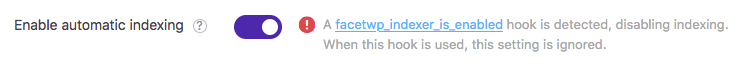 When the facetwp_indexer_is_enabled hook is used like above, the setting will display a warning, because in this scenario, the setting is ignored: