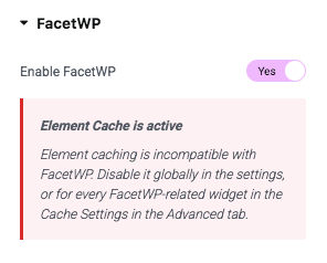 Be warned that Element Caching is incompatible with FacetWP. Depending on the type of widget this setting is enabled on, Element Caching can cause the following issues: